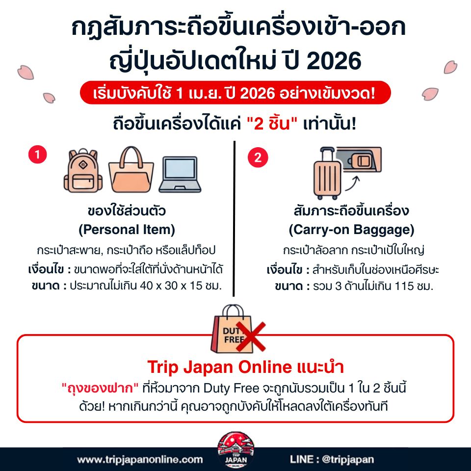 ตั้งแต่วันที่ 1 เมษายน ปี 2026 เป็นต้นไป สมาคมสายการบินญี่ปุ่น (定期航空協会) ได้ร่วมมือกับสำนักงานการบินพลเรือนญี่ปุ่น (JCAB) บังคับใช้กฎสัมภาระถือขึ้นเครื่อง (Carry-on Baggage) อย่างเข้มงวดมากขึ้น ครอบคลุมทั้งเที่ยวบินในประเทศและระหว่างประเทศที่เข้า-ออกญี่ปุ่น