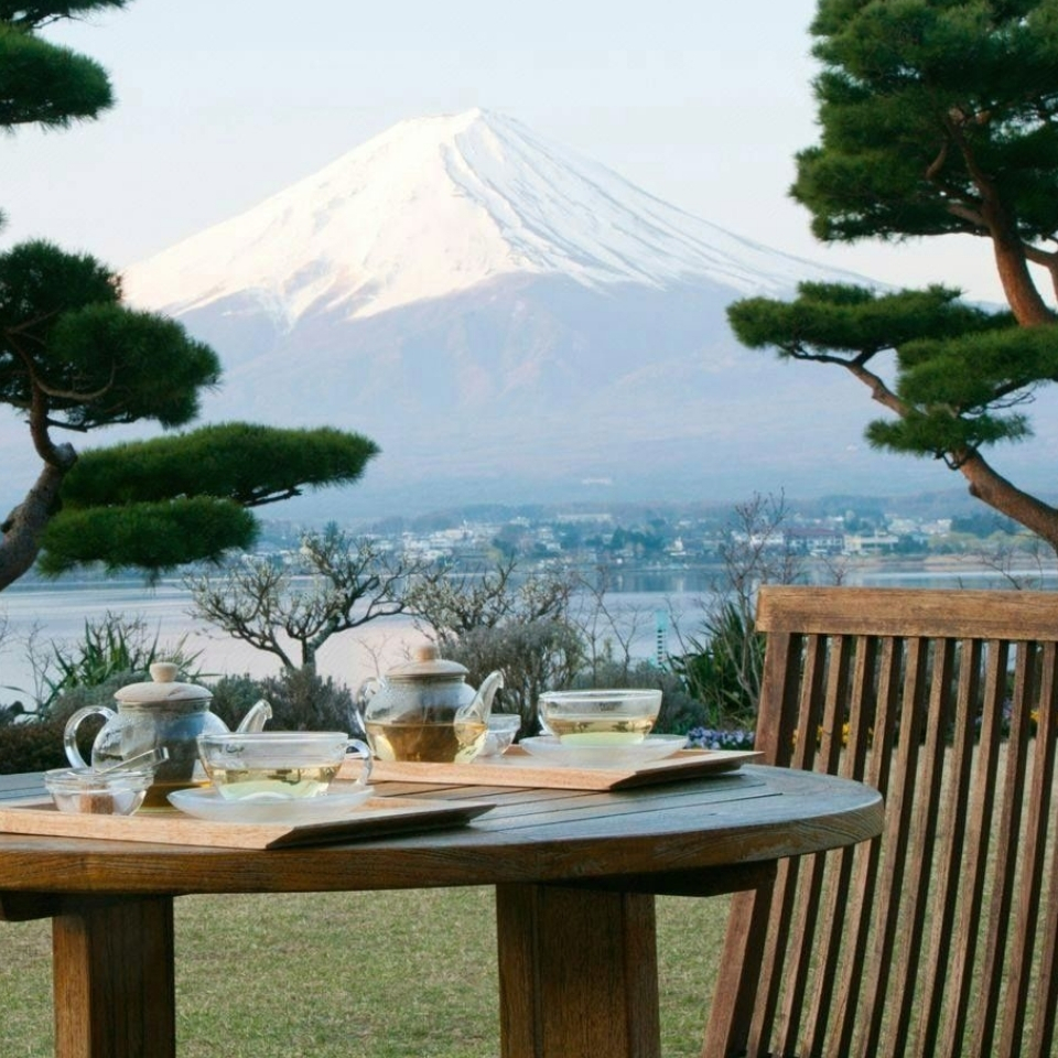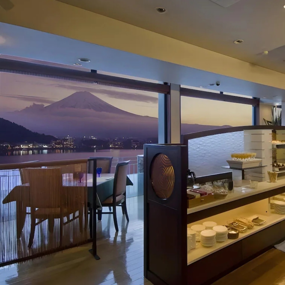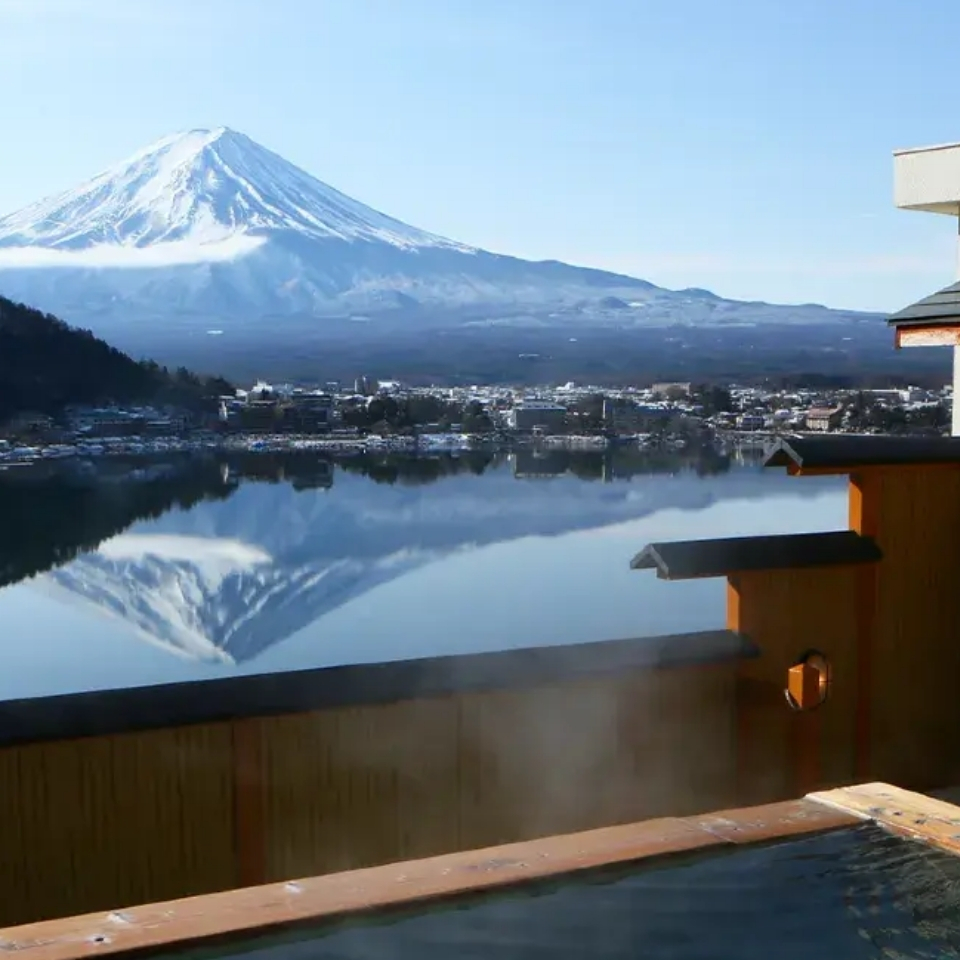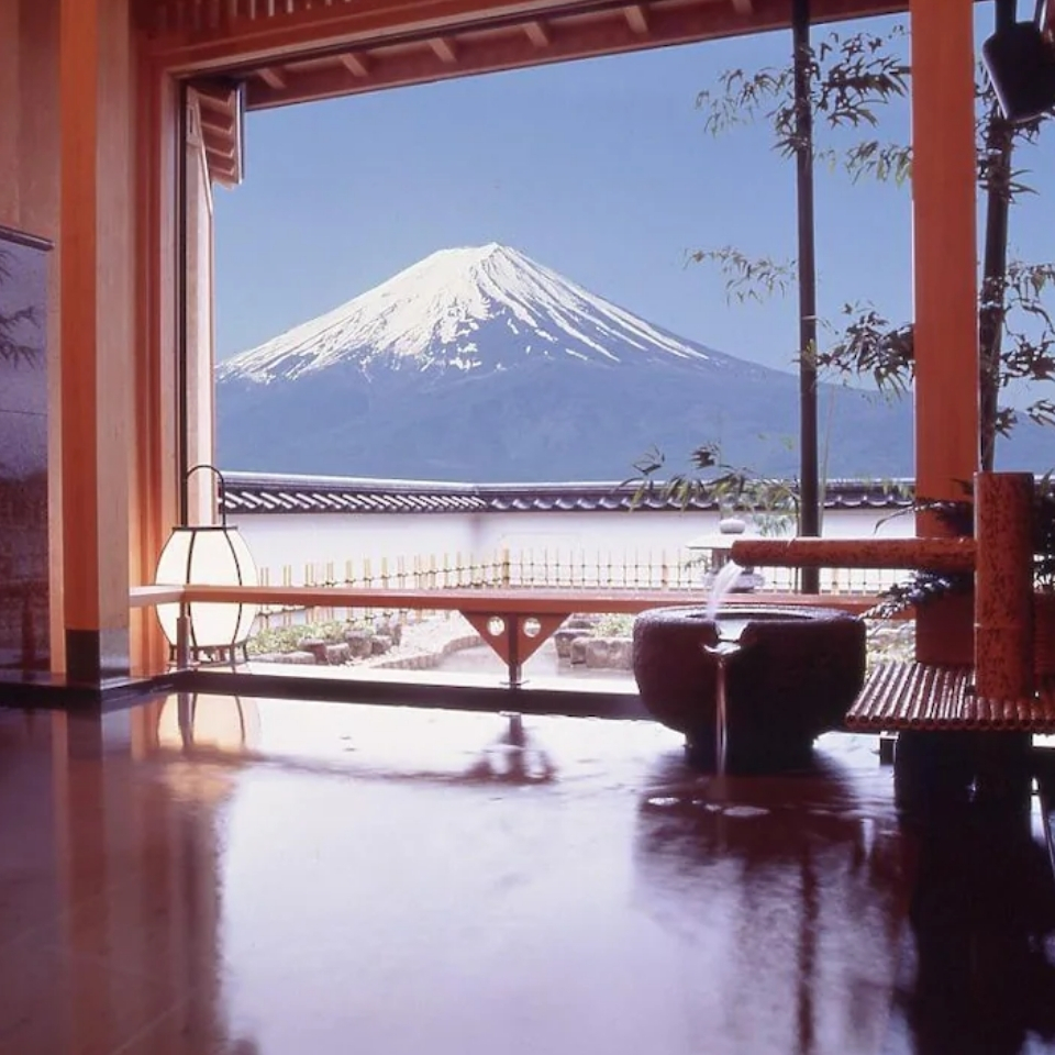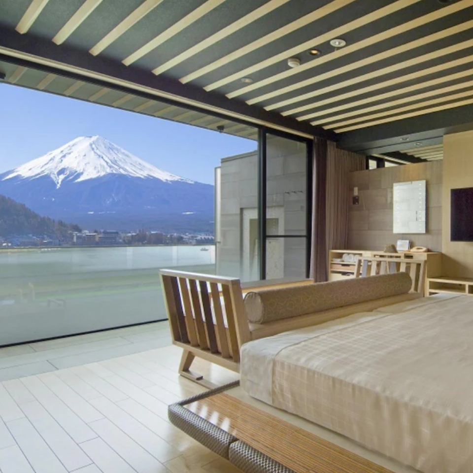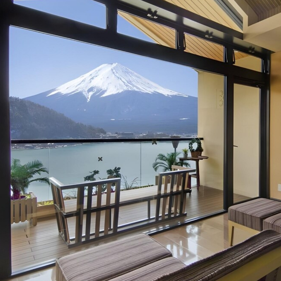 ถ้ามีตำแหน่ง “ที่เห็นวิวฟูจิแบบสวย ๆ” ที่คาวากุจิโกะ ก็ต้องขอมอบมงให้กับ Shuhokaku Kogetsu อย่างไม่มีข้อโต้แย้ง ที่นี่คือที่สุดของที่สุดจริง ๆ! ความลับของ Kogetsu คือ “ทำเลที่ตั้ง” โรงแรมนี้ตั้งอยู่ตรงหัวมุมฝั่งทิศเหนือของทะเลสาบ ซึ่งเป็นมุมที่มองเห็นฟูจิซังได้แบบเต็ม ๆ และได้ทะเลสาบคาวากุจิโกะเป็นฉากหน้าแบบพอดิบพอดี และความพีคคือ… ที่นี่การันตีวิวฟูจิจากทุกห้องพัก! ไม่ต้องลุ้น ไม่ต้องเสี่ยงดวง จองห้องไหนก็ได้วิวฟูจิเต็มตาแน่นอน ลองจินตนาการถึงการตื่นเช้ามาในห้องพักสไตล์เรียวกัง ค่อย ๆ เปิดหน้าต่างออกไป แล้วพบกับภาพฟูจิซังยามเช้าสะท้อนผืนน้ำแค่นี้ก็คุ้มค่าทุกเยนที่จ่ายไปแล้ว นอกจากนี้สวนญี่ปุ่นริมทะเลสาบของโรงแรมยังเห็นยาวไปจนถึงริมน้ำ ให้คุณใส่ชุดยูกาตะเดินเล่นถ่ายรูปกับฟูจิได้อย่างเป็นส่วนตัว ส่วนออนเซ็นกลางแจ้ง ก็ไม่ต้องพูดถึง… มันคือการแช่ตัวในบ่อน้ำร้อนที่เต็มไปด้งบไอหมอก โดยมีภาพฟูจิซังอยู่ตรงหน้า เป็นความฟินระดับ 10/10