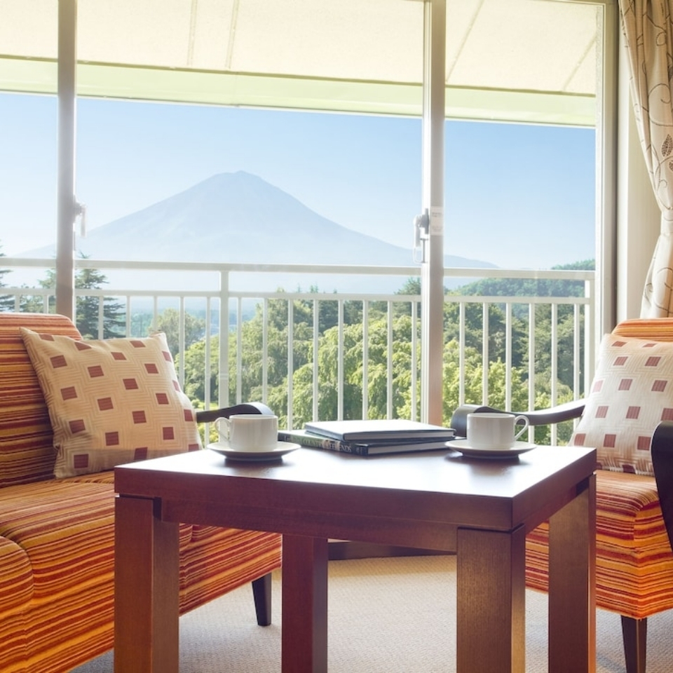 Fuji View Hotel คือตัวเลือกสำหรับคนที่ต้องการ “หนี” ความวุ่นวายและ “พักผ่อน” โรงแรมเก่าแก่ที่มีจุดเด่นไม่ใช่การอยู่ติดริมน้ำ แต่เป็น “สวนส่วนตัวขนาดใหญ่กว่า 30,000 สึโบะ (เกือบ 100 ไร่!)” ที่โอบล้อมโรงแรมไว้ ให้บรรยากาศเหมือนพักผ่อนอยู่ในป่าที่เงียบสงบ คุณสามารถเดินเล่นในสวนที่เต็มไปด้วยต้นไม้ใหญ่และดอกไม้ตามฤดูกาล, เล่นเทนนิส, หรือแค่นั่งจิบชาชมวิวสวนเงียบ ๆ ก็ได้ ที่นี่ก็เห็นวิวฟูจิเช่นกัน แต่อาจจะเป็นวิวจากมุมที่ไกลออกมาหน่อย หรือเห็นผ่านทิวไม้ในสวน ซึ่งก็ให้ความรู้สึกสวยงามและสงบไปอีกแบบ ออนเซ็นของที่นี่ก็เป็นไฮไลท์ เพราะเป็นบ่อกลางแจ้งที่ให้ความรู้สึกเหมือน “แช่ออนเซ็นกลางป่า” จริง ๆ ได้ยินเสียงลมและกลิ่นดิน ที่นี่จึงเหมาะกับคนที่ไม่ได้ซีเรียสว่าต้องเห็นฟูจิจากเตียง แต่ต้องการพื้นที่สีเขียว ความสงบ และการพักผ่อน