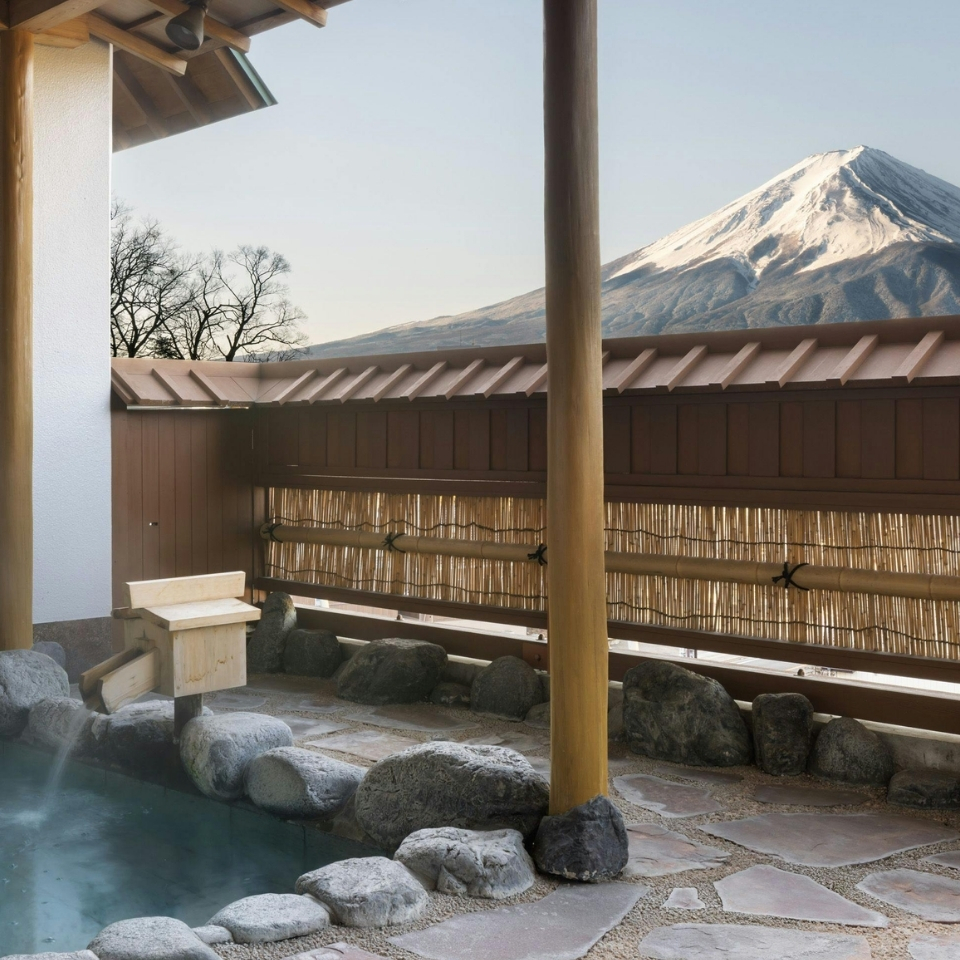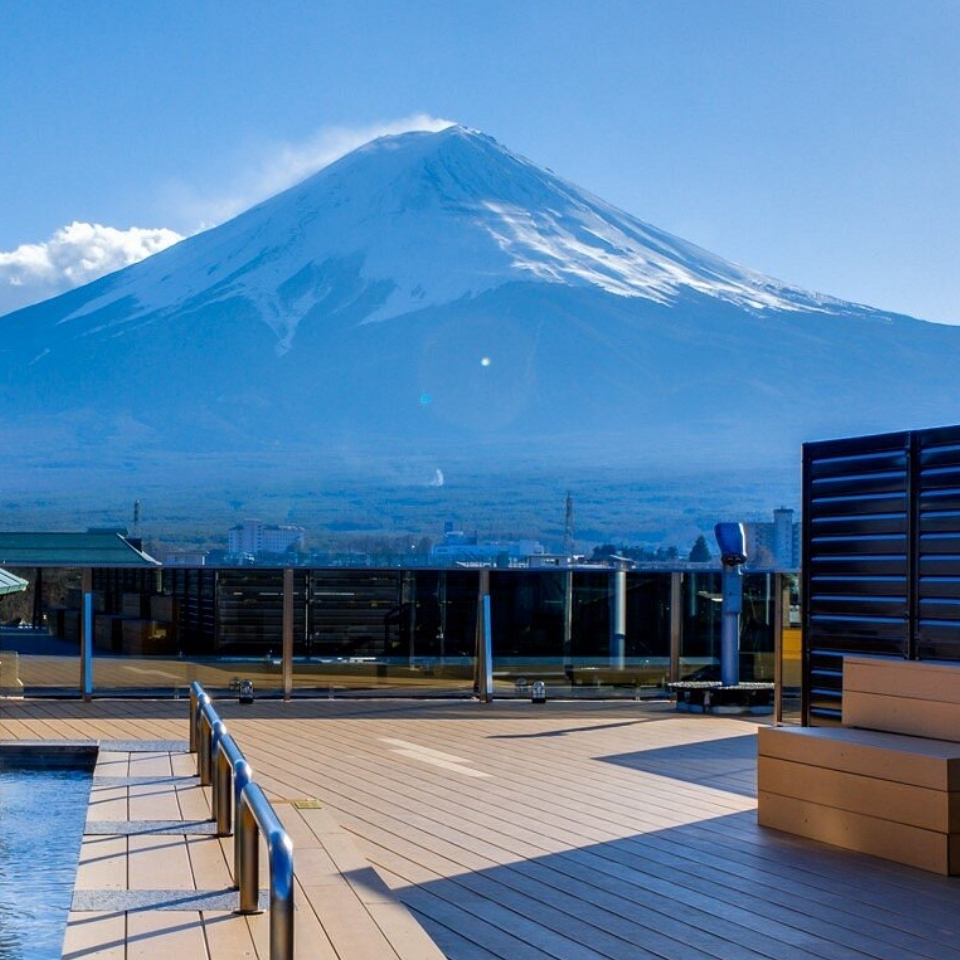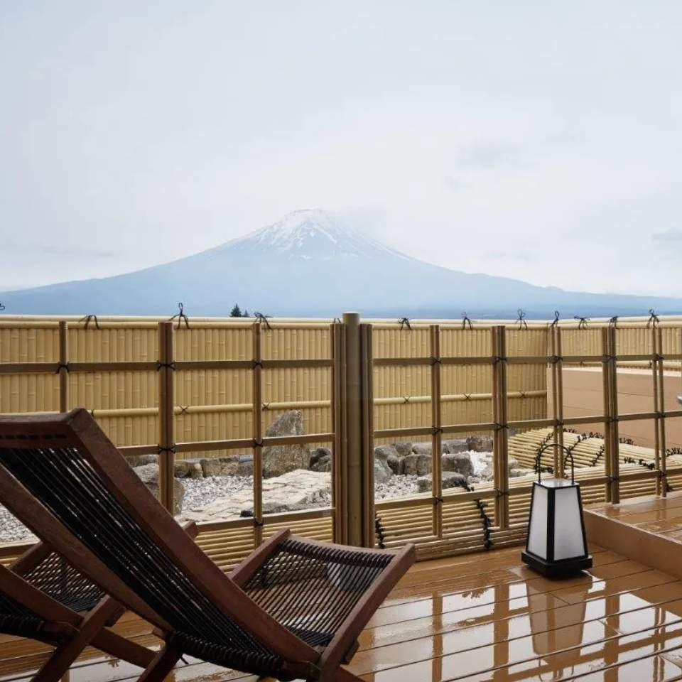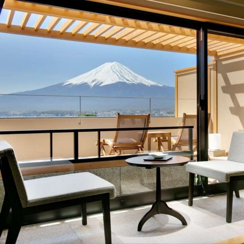 สำหรับใครที่มองหาความโรแมนติก แต่ชอบดีไซน์ที่ผสมผสานระหว่างความญี่ปุ่นดั้งเดิมและความโมเดิร์นอย่างลงตัว Fuji Ginkei คือตัวเลือกที่น่าสนใจมาก Fuji Ginkei เป็นเรียวกังในเครือเดียวกับ Fujikawaguchiko Onsen Konansou แต่มีขนาดเล็กกว่าและให้ความรู้สึกเป็นส่วนตัวมากกว่า ตั้งอยู่ในทำเลทองติดริมทะเลสาบเช่นกัน จุดเด่นของที่นี่คือการออกแบบที่เรียบหรู อบอุ่น และใส่ใจในรายละเอียด ไฮไลท์เด็ดคือ “Tsuki no Terrace” หรือ “ระเบียงจันทรา” ซึ่งเป็นพื้นที่ส่วนกลางให้แขกได้ออกมานั่งพักผ่อนชมวิวฟูจิสะท้อนน้ำในตอนกลางวัน หรือชมจันทร์ในตอนกลางคืน บรรยากาศโรแมนติกมากจริง ๆ ออนเซ็นดาดฟ้าของที่นี่ก็ไม่ธรรมดา เป็นบ่อแบบ Infinity Edge ที่ให้วิวฟูจิแบบพาโนรามาสุดสายตา ห้องพักมีให้เลือกทั้งแบบญี่ปุ่น (ฟูก) และแบบผสม (มีเตียง) ตอบโจทย์คนที่ไม่ชินกับการนอนฟูก และบริการที่นี่ก็ขึ้นชื่อเรื่องความใส่ใจและอบอุ่น