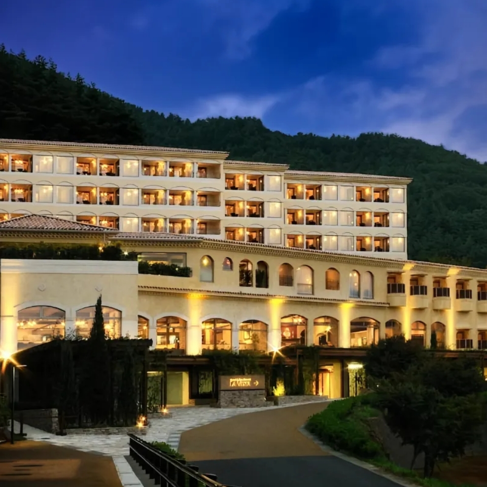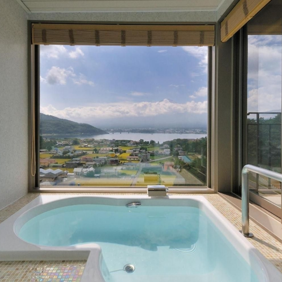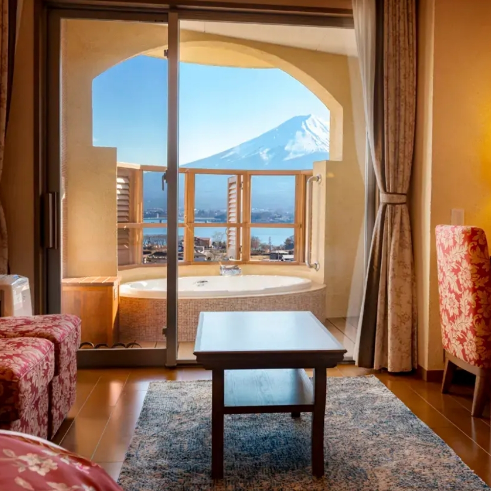 อยากได้ฟีลโรแมนติกแบบไปเที่ยวยุโรป แต่มีฉากหลังเป็นฟูจิซังไหม? ถ้าใช่ La Vista Fujikawaguchiko คือคำตอบที่เพอร์เฟกต์ที่สุด! ที่นี่ฉีกทุกกฎของที่พักใน Kawaguchiko ด้วยการออกแบบสไตล์ “โพรวองซ์” (ยุโรปตอนใต้) เหมือนยกหมู่บ้านเล็ก ๆ ในอิตาลีหรือฝรั่งเศสมาตั้งไว้ริมทะเลสาบ แต่จุดขายที่แรงที่สุดและทำให้ที่นี่ฮิต คือ “ออนเซ็นส่วนตัวแบบเช่าเหมา (Kashikiri Onsen) ถึง 4 แบบ ที่ให้แขกเข้าพักใช้บริการได้ฟรี!” มีทั้งบ่อหิน, บ่อไม้, และบ่อเซรามิก แถมบางบ่อยังมีวิวฟูจิอีกด้วย นอกจากนี้ห้องพักทุกห้องยังมี “ระเบียงส่วนตัว” ที่มีอ่างอาบน้ำสไตล์ยุโรป (บางห้องเป็นอ่างจากุซซี่) ให้คุณแช่ตัวชมวิวฟูจิได้จากห้องเลย และที่นี่ยังขึ้นชื่อเรื่อง “ความคุ้มค่า” เพราะมีบริการฟรีจุกจิกที่น่ารักมาก ทั้ง Welcome Drink, ไอศกรีมฟรี, และราเมงมื้อดึกฟรี!